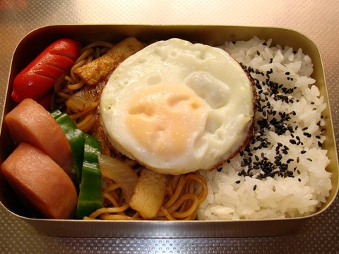 冷蔵庫内の残り物を駆使(?)した焼きそば弁当~。